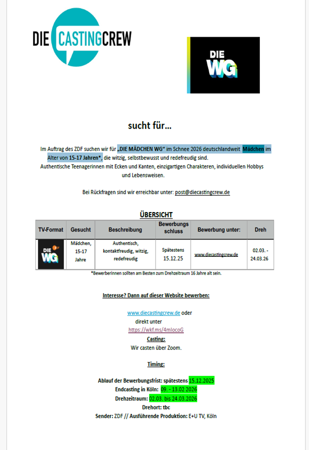 ZDF - 'Die Mädchen WG' im Schnee 2026 sucht deutschlandweit Mädchen im Alter von 15-17 Jahren